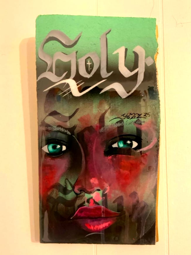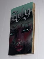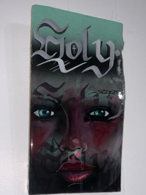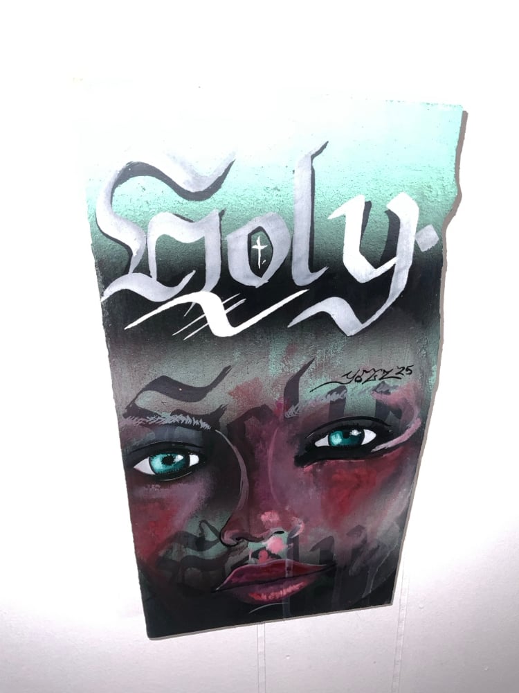 Medium: Acrylic brush work with Aerosol coated with a 2 part Epoxy Resin.